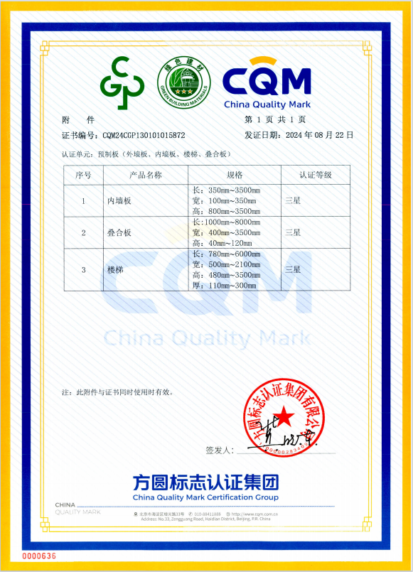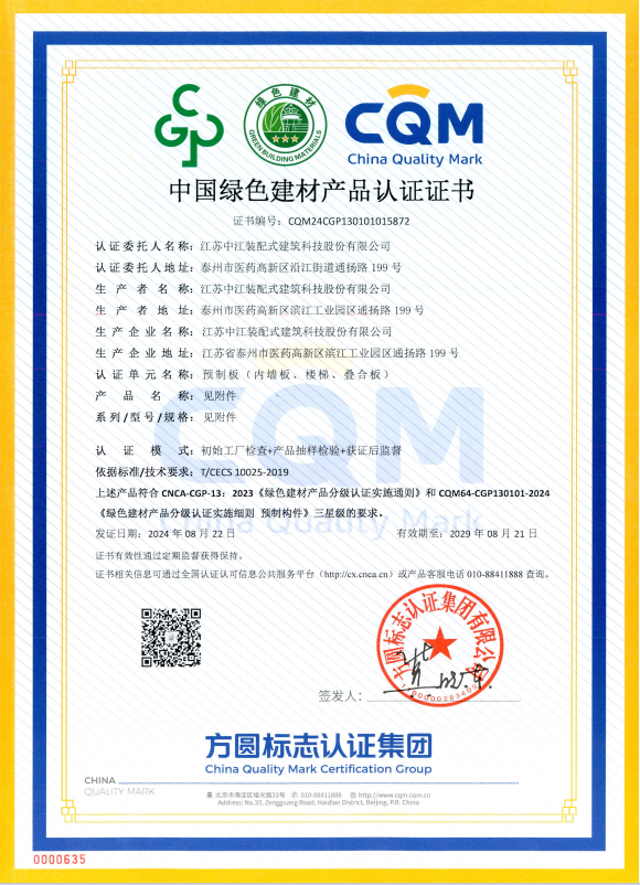 本次认证范围涵盖厂区环境、研发设计、生产管理、产品品质及工艺设计等多维度,经认证中心专家组的严格评估与确认,装配式公司在资源节约、能源消耗、环境属性及产品性能等方面的关键指标均达到标准。此次认证的顺利通过,提升了公司的品牌影响力,增强了公司在绿色制造领域的市场竞争力。