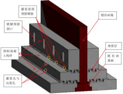 装配式基础施工技术,替代传统现场浇筑钢筋混凝土基础。采用工厂预制混凝土加固构件,通过模块化拼装实现基础承载力提升。解决老城区基础承载力不足问题,构件提前预制,吊装便捷,避免混凝土搅拌车运输受限难题,工期缩短30 %以上。先在工厂预制预留销键安装洞的混凝土构件,待现场完成基坑开挖、素土夯实及垫层浇筑后,按“台阶1→台阶2→台阶3”的顺序吊装预制构件,且每层吊装后均进行座浆处理;随后安装型钢销键,通过间距不超过1 m的灌浆套筒灌注H40灌浆料实现构件连接,再完成销键端部封板、销轴锁扣固定及砂浆封头工序,最后对暗柱及接缝进行现浇衔接,待混凝土养护达标后开展基坑回填作业。
