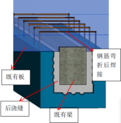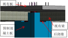 预制混凝土构件加固梁技术,预制混凝土构件贴合既有梁两侧及底部,通过焊接、后浇缝浇筑形成整体受力体系,提升梁的承载力和刚度。先在工厂预制带抗剪键槽的混凝土构件(单段长度不超过4 m,超长则分段制作),施工前凿穿上层楼板对应洞口,铲除原梁表面装修层并对梁体进行凿毛处理,完成梁/梁柱节点植筋后,将预制构件吊装至指定位置并通过临时脚手架支撑固定;随后弯折构件预留钢筋并焊接形成箍筋闭环,同时焊接顶筋及纵筋,再对宽度不小于300 mm的后浇缝灌注灌浆料,待灌浆料养护达标后拆除临时支撑。